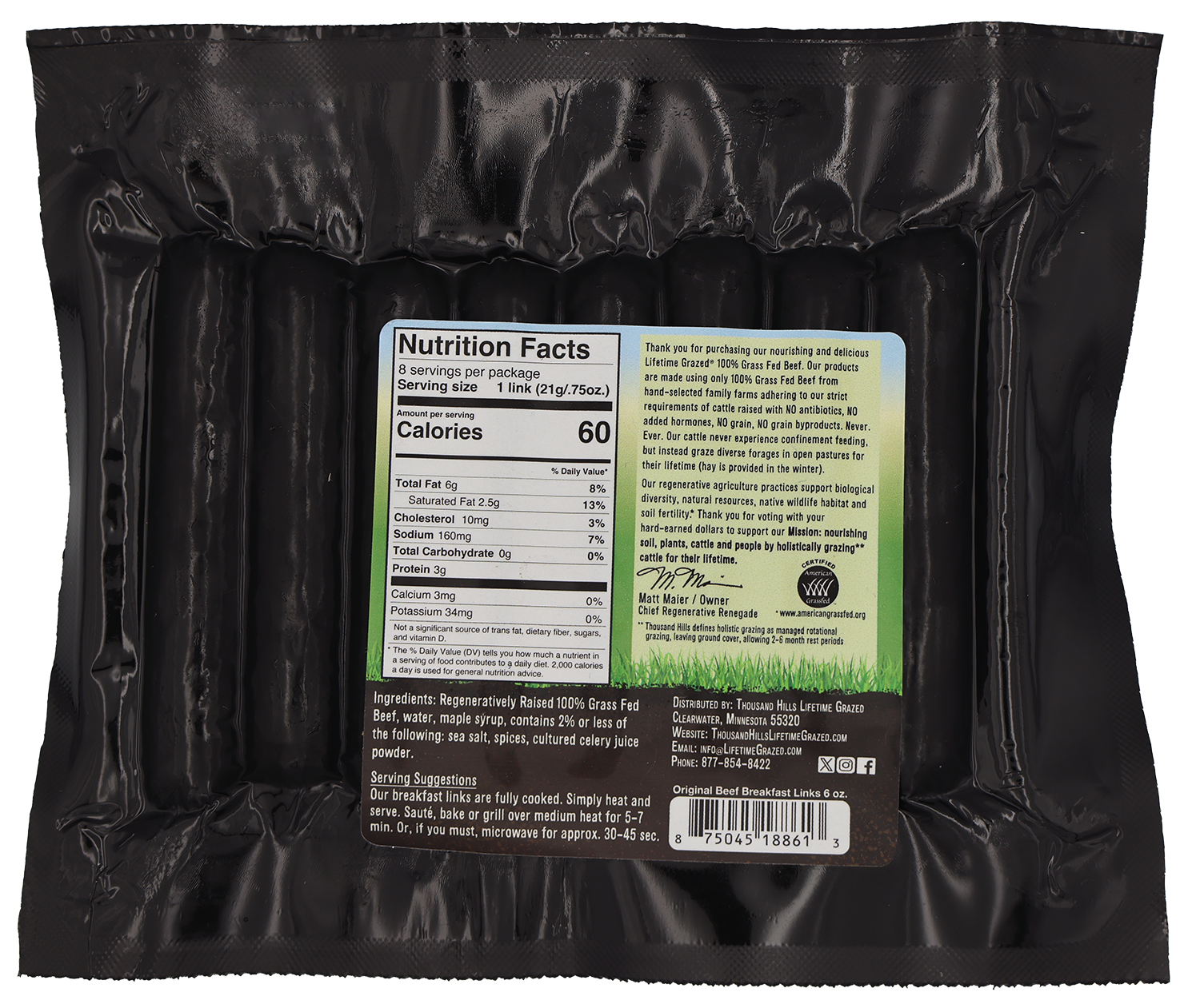 Unit price / perStart the day right with 100% grass fed beef breakfast links. This heart healthy option is loaded with flavor and is sure to be a hit with the family. These are smoked and fully cooked to simplify your meal preparation.