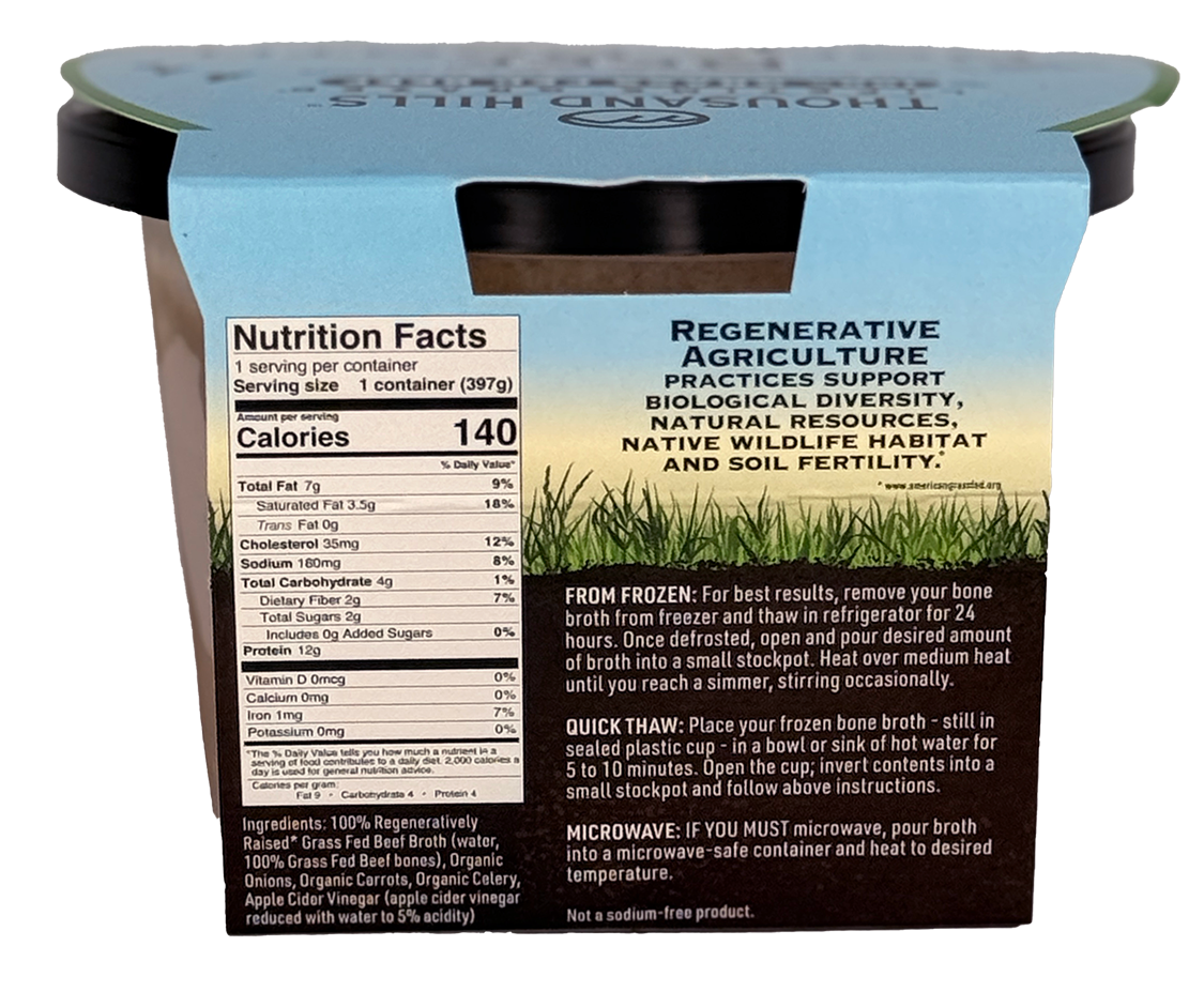 Ingredients:100% Grass Fed Regenerative Beef Broth, water, Grass fed beef bones, organic onion, organic carrots, organic celery, apple cider vinegar (apple cider vinegar reduced with water to 5% acidity).