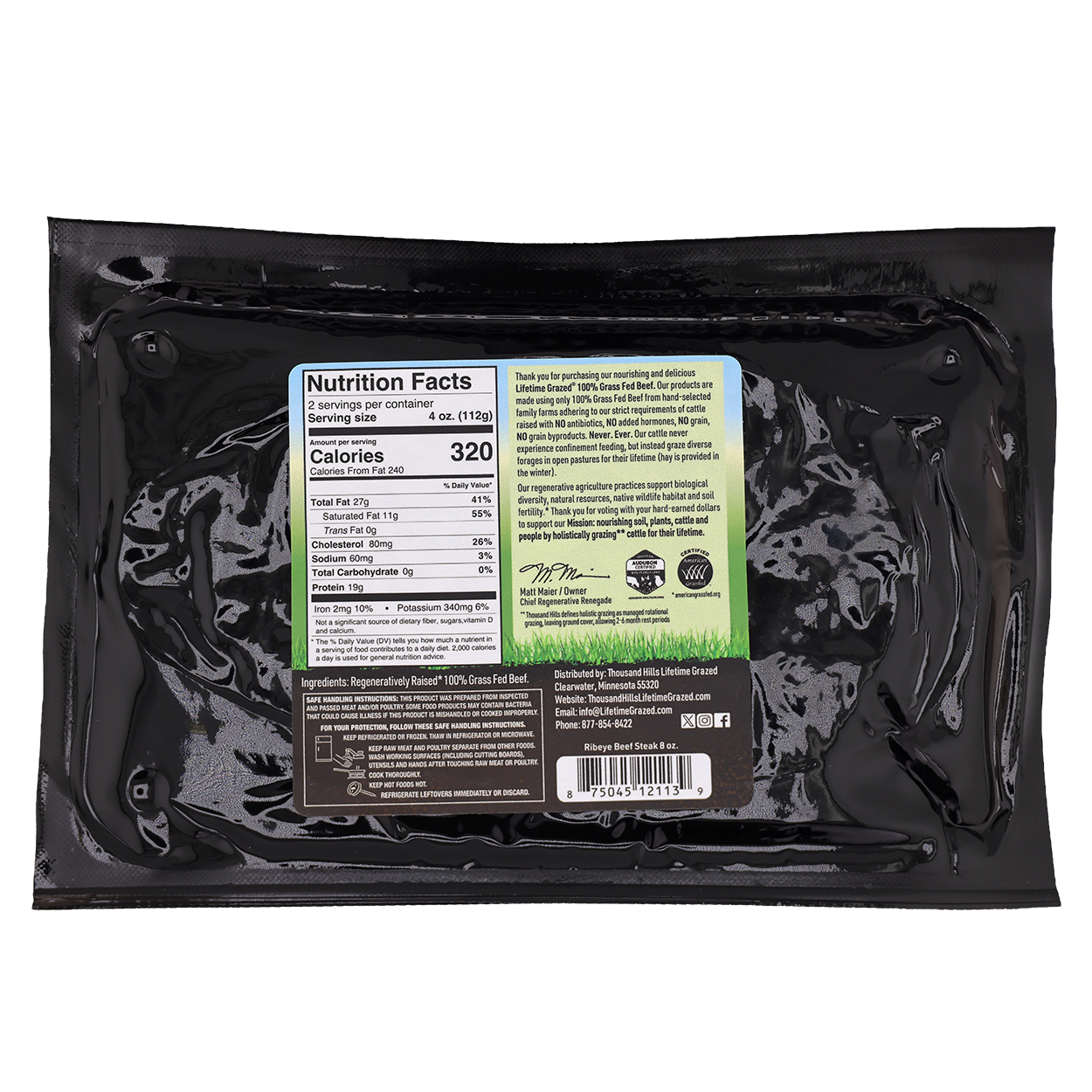 Savor the steakhouse classic with our Grass Fed Ribeye Steak. Find grass fed beef near you or buy this 100% grass-fed ribeye online for a perfect experience for any occasion. Whether you're exploring organic beef options or supporting regenerative agriculture, this cut delivers clean, nutrient-dense protein you can feel great about. Add it to your cart today and taste the Thousand Hills difference.