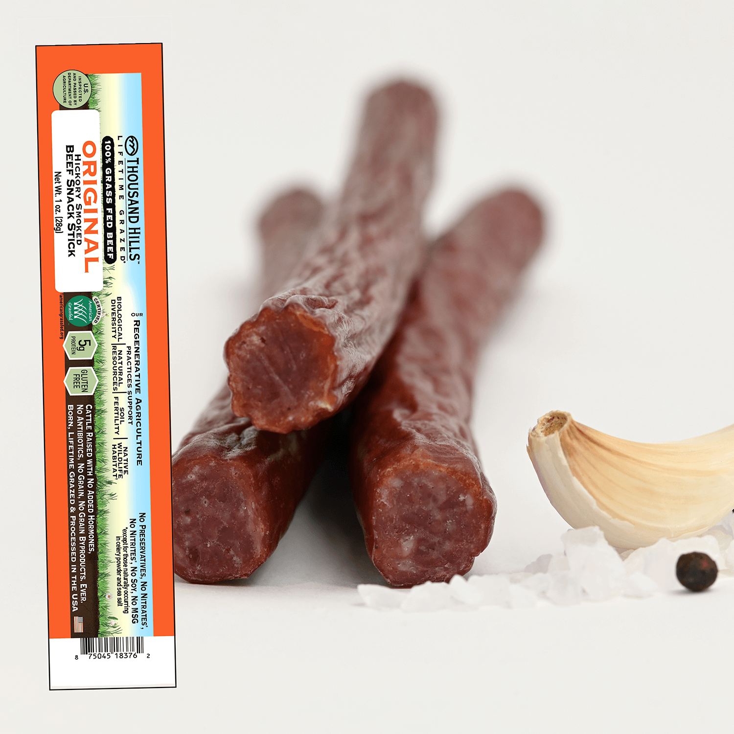 Ingredients: 100% Grass Fed Regenerative Beef, water, sea salt, organic dextrose from tapioca, celery juice powder, organic spices including: (black pepper, garlic powder, coriander), lactic acid starter culture