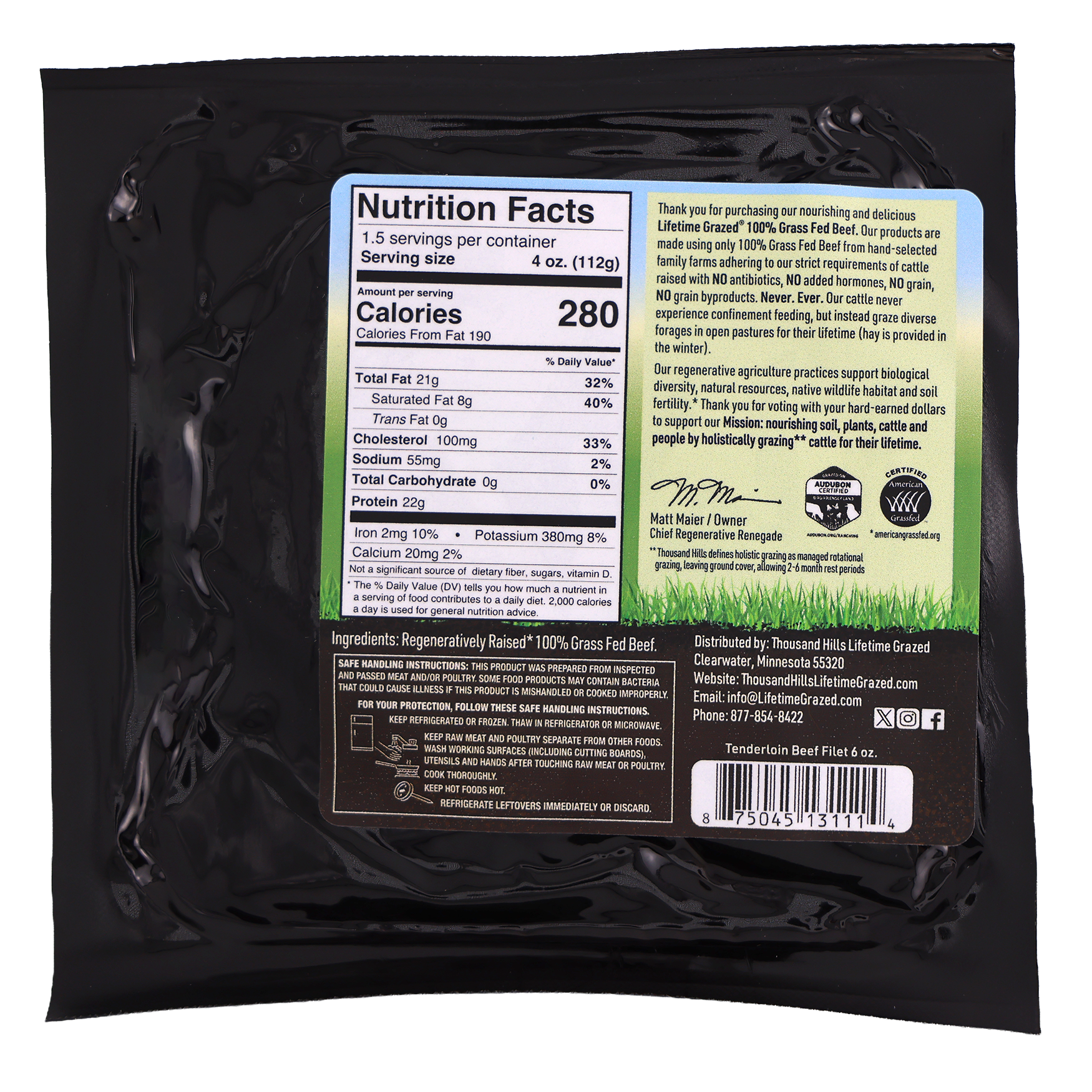 Indulge in the ultimate steak experience with our Grass Fed Tenderloin Filet. Find grass fed beef near you or buy this premium 100% grass fed filet online for unmatched tenderness and clean, beef-forward flavor. This cut is the perfect choice for those seeking grass fed beef raised through regenerative agriculture. Add it to your cart today and enjoy the Thousand Hills difference.