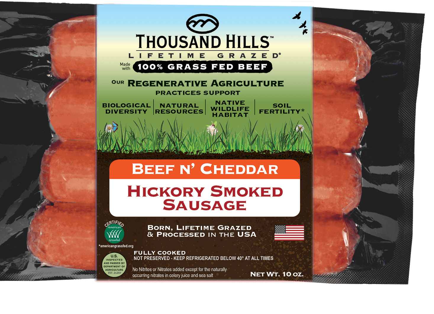 Ingredients: 100% Grass Fed Regenerative Beef, natural cheddar cheese (cultured pasteurized milk, salt, enzymes, annatto vegetable color), water, contains 2% or less of: sea salt, black pepper, mustard seed, turbinado sugar, marjoram, oregano, garlic powder, and cultured celery powder.