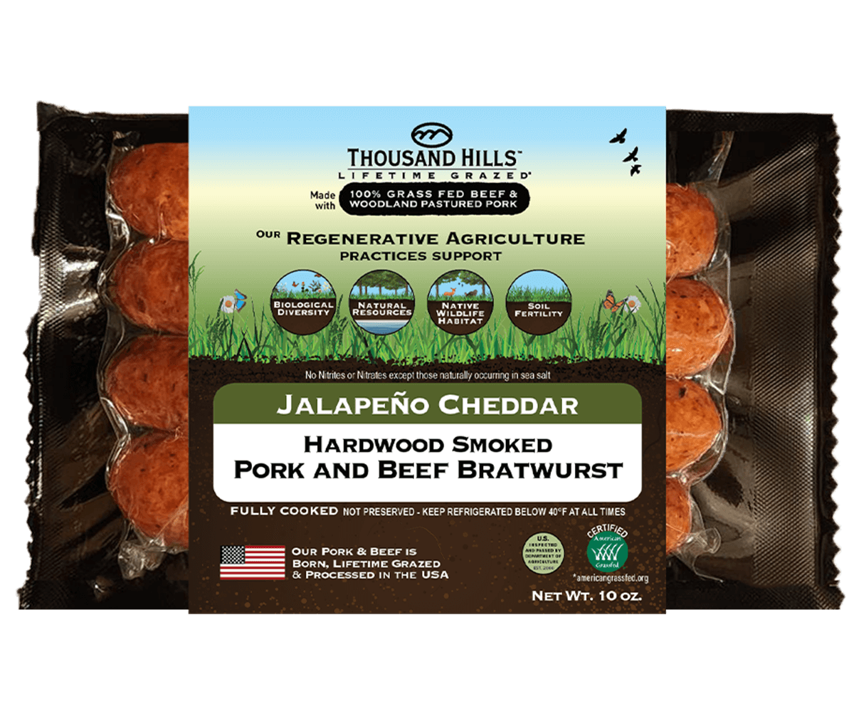 Unit price / perThousand Hills’ NEW Pork & Beef Jalapeno Cheddar Brat, a flavorful blend of 100% grass-fed beef, woodland-pastured pork, jalapeno peppers, and creamy cheddar cheese, crafted with premium-quality ingredients for a delicious and satisfying meal experience.